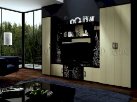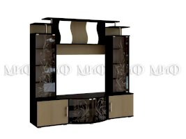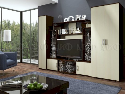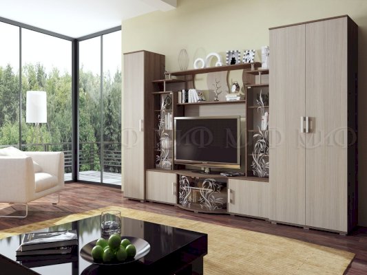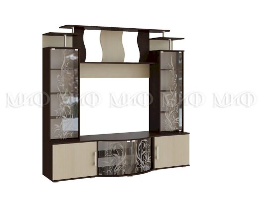 Актуальная модель с большой нишей под TV. Стеклянные дверцы стеллажей декорированы растительным узором. Роскошный вариант для стильного интерьера гостиной комнаты.